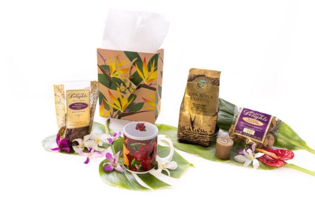 This gift bag is filled with hand made Kona coffee cookies, Hawaiian macadamia nut biscotti, and fresh 100% Kona coffee in a 7 ounce bag. Â We add a beautiful Hawaiian print coffee mug and fragrant Kona coffee candle. Our candle is hand made with natural soy. Â Choco mochi is a treat from Japan. Â We’ll pack your Kona coffee gift in a tropical print gift bag or wrapped in a lauhala basket tied with craft raffia. Makes a unique holiday basket for any coffee drinker.